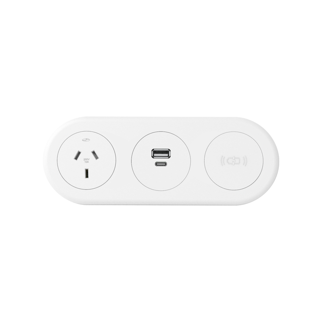 Echo series delivers the latest charging technology to empower engaging and connected spaces within the commercial workplace, integrating into personal workstations, soft-seating and collaborative spaces. This module has both USB A/C Charging and Wireless Charging and a GPO. The module has a shallow depth of 46mm, with easy top-side installation without fastening from the bottom