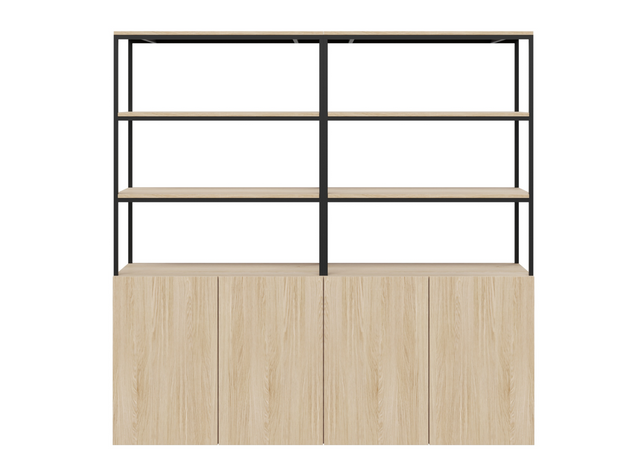 The Banc Welded Unit features a seamless blend of enclosed storage and open welded shelving, unified by matching finishes for a clean, modern look