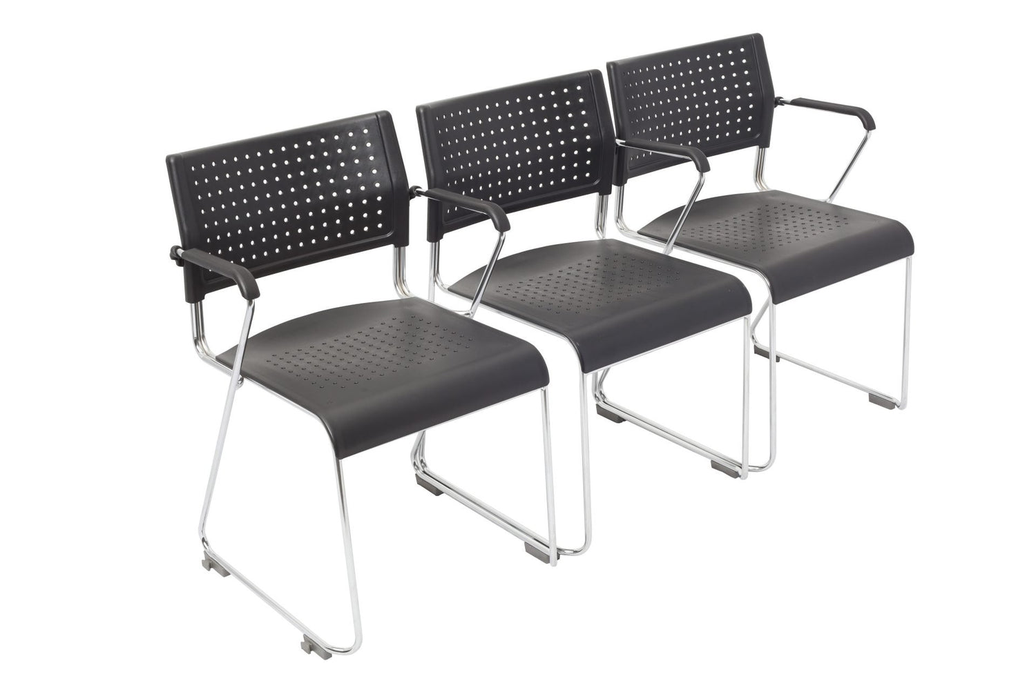 Very versatile chair with black plastic perforated back and waterfall seat and chrome steel rod sled base. The chair stacks and links and has options for a fabric seat or back pad, tablet arm and can be moved with a trolley.
