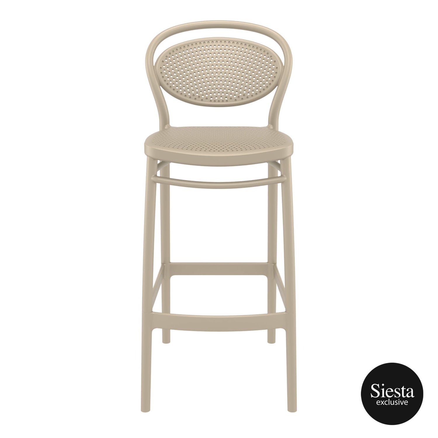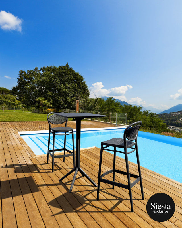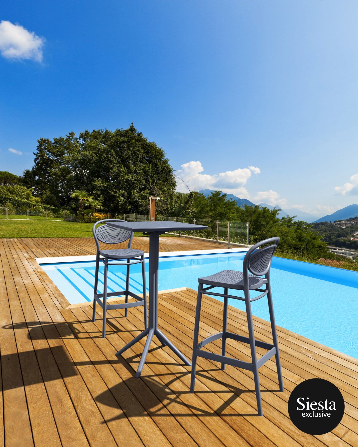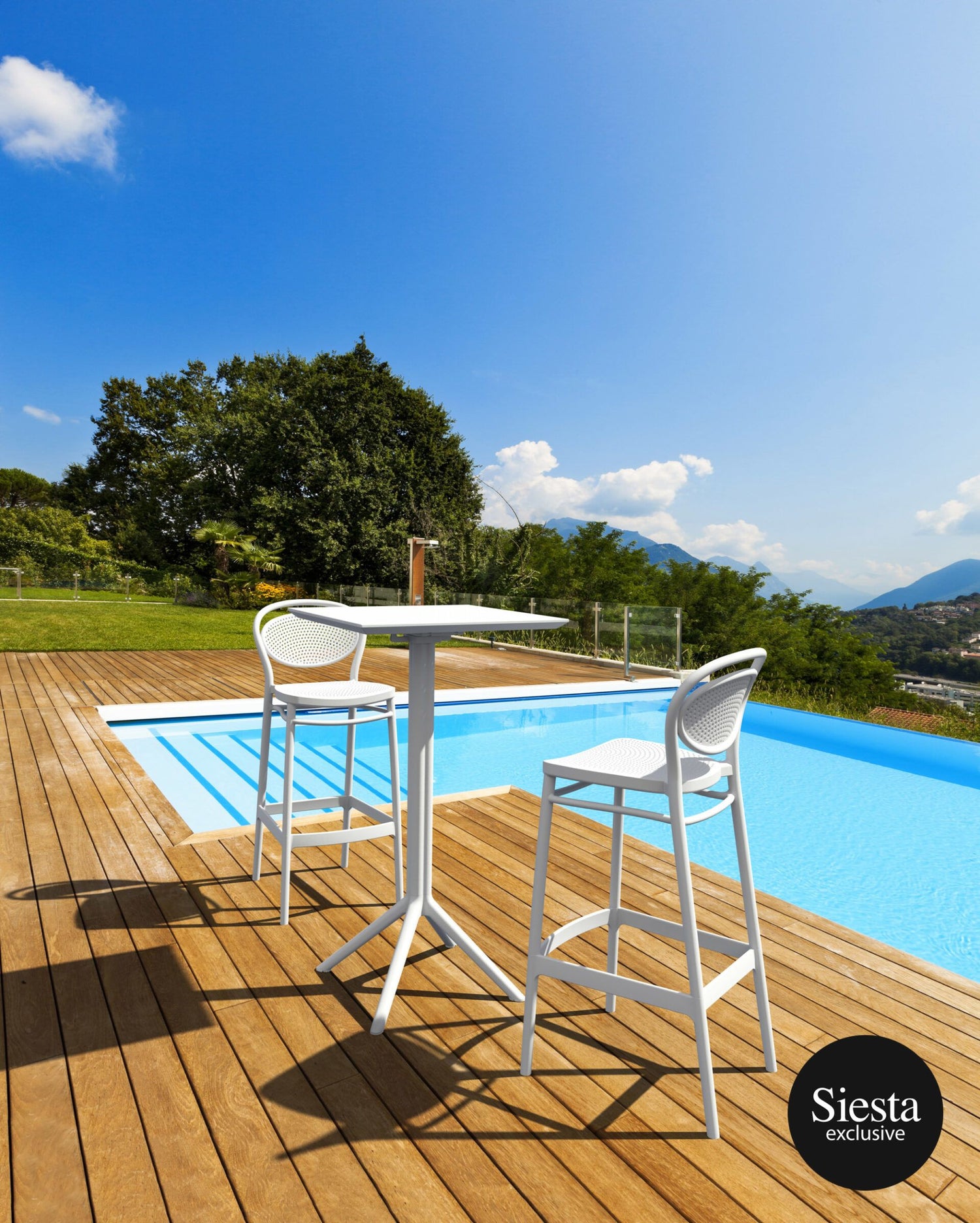 Marcel bar stool h.75 cm is produced with a single injection of polypropylene reinforced with glass fibre obtained by means of the latest generation of air moulding technology with neutral tones. For indoor and outdoor use. The Sky Table 60 is foldable and produced with polypropylene reinforced with glass fiber obtained by means of the latest generation of air moulding technology