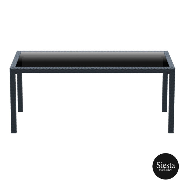 Introducing the Tahiti Table - 1800 w x 940d mm, a versatile and stylish addition to any indoor or shaded outdoor space. Crafted with meticulous attention to detail, this table boasts a 5mm dark tempered glass top supported by an aluminium frame covered with semi UV stabilised polypropylene, ensuring both durability and aesthetic appeal.