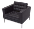 Elegant reception area arm chair with button finish to black PU, easy clean upholstery. Stainless steel underframe and legs.