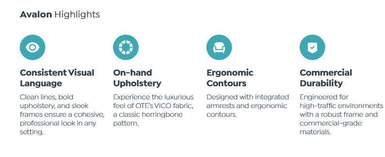 Each piece can be used independently or combined to create a unified, inviting space. Available in armchair, two-seater, and three-seater configurations, the Avalon provides maximum adaptability for reception areas, breakout zones, and collaborative lounges that balance aesthetics and functionality.
