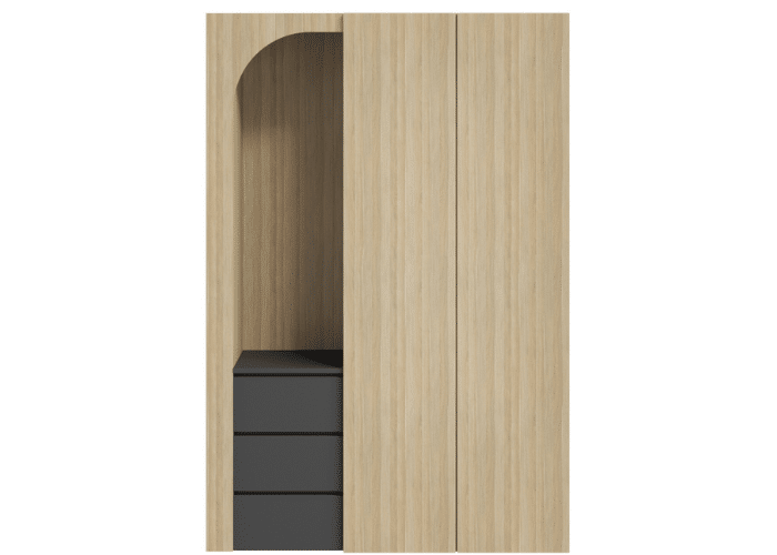 Etta’s curved cupboards offer an elegant solution for organizing printer or coffee-break areas. With two style options of tall and low height cupboards, they effortlessly combine functionality with modern design.
