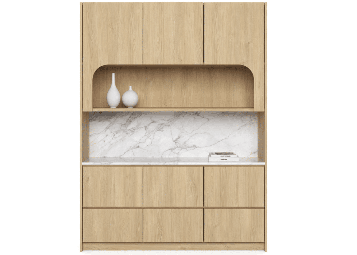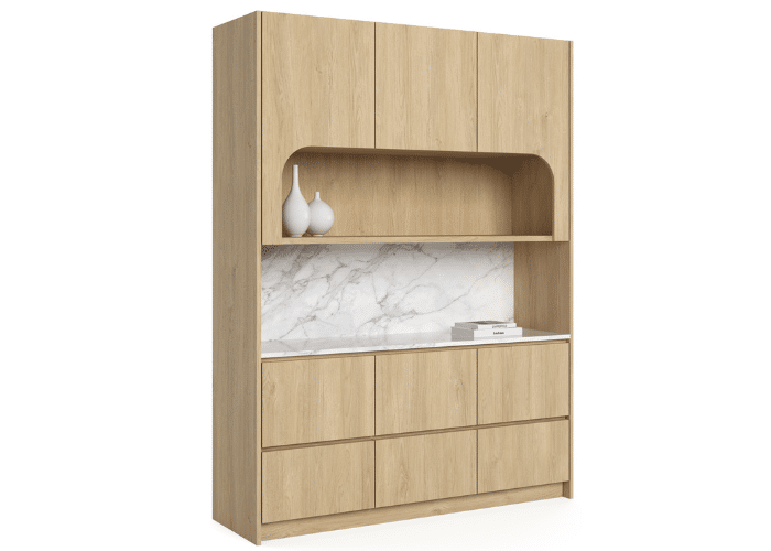 Bria represents a meticulously designed wall unit that provides functionality as a dry kitchen space or a breakout service utility area, seamlessly blending elegant curves and a marble-like finish for a sophisticated storage solution.