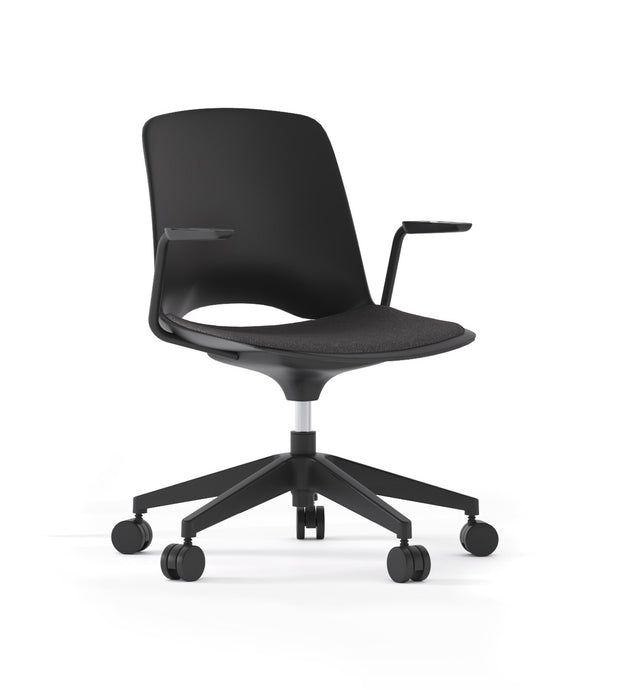 Introducing the Vista Padded Seat Boardroom Chair. A premium 360-degree model combining practicality, versality and functionality. The Vista Swivel features a contoured seat and backrest and a choice of various matching seat upholstery colours. It has a sturdy nylon 5-star base and 60mm castors on each foot ensuring its impressive 140kg weight rating and is fitted with armrests for additional comfort.