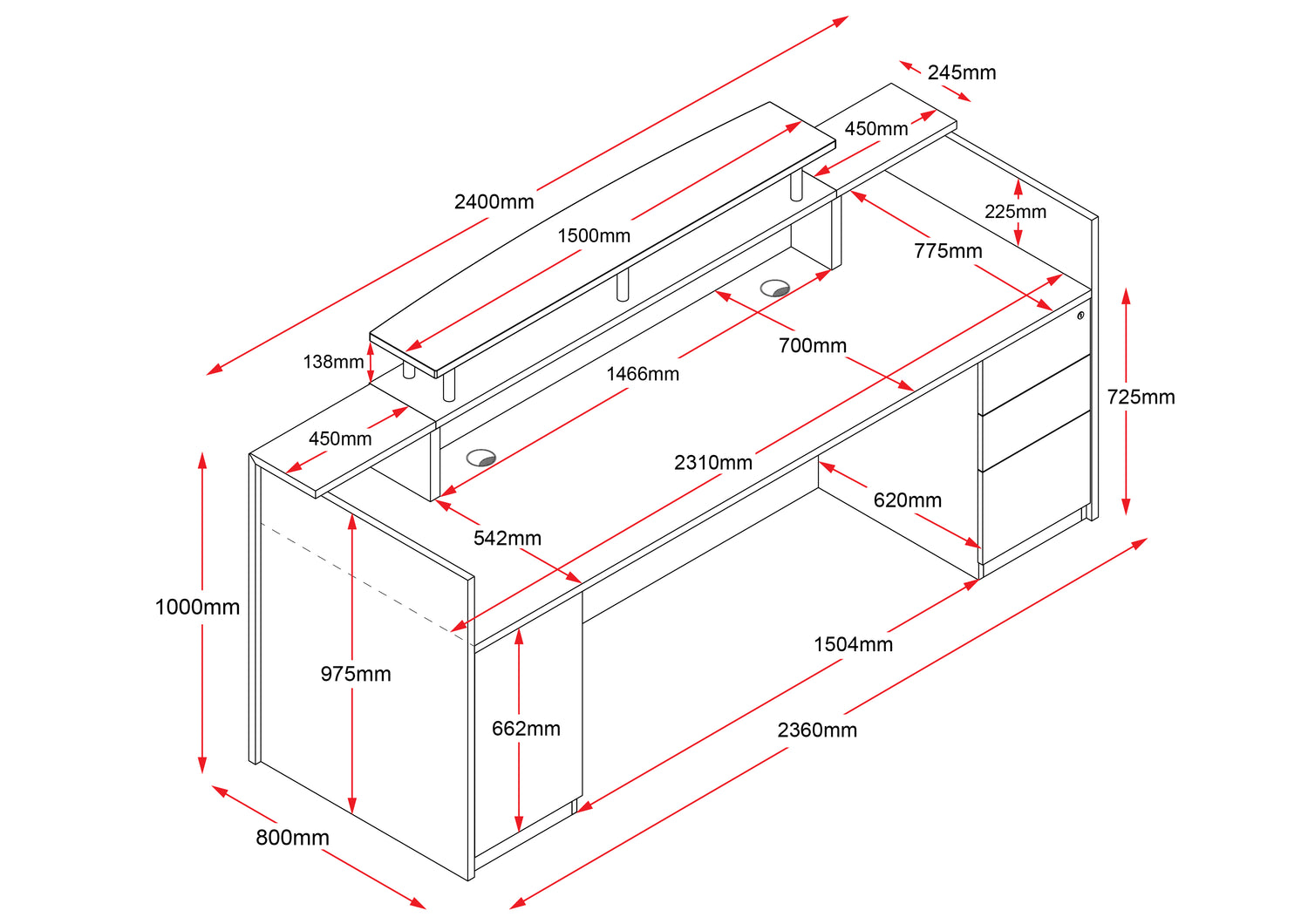 - Built in 3 drawer pedestal, CPU and storage cupboard and chrome cable entry covers